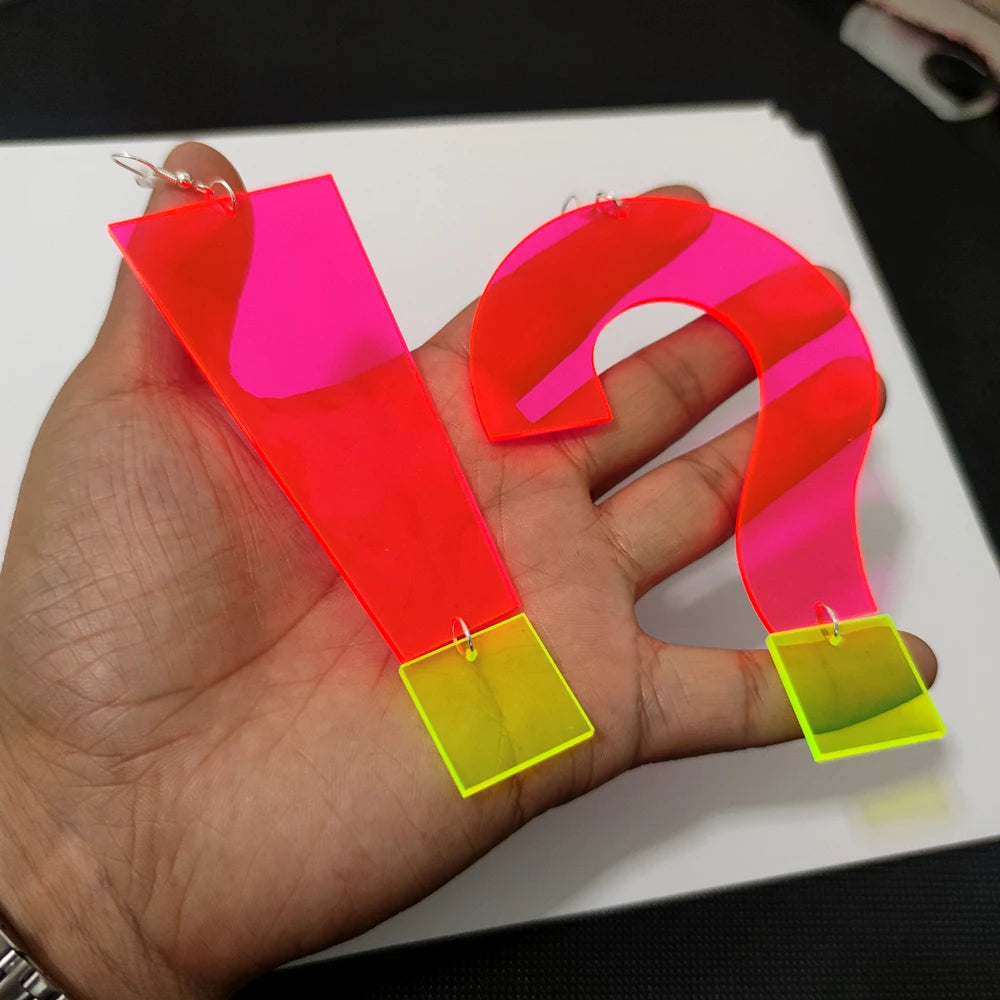 Take a risk and stand out with KUGUYS Neon Pink Large Big Dangle Earrings! These eye-catching earrings are made of durable acrylic and zinc alloy materials, featuring a bold drop design and a unique "!?" shape pattern. Embrace the hip-hop vibe and elevate your style game with KUGUYS!